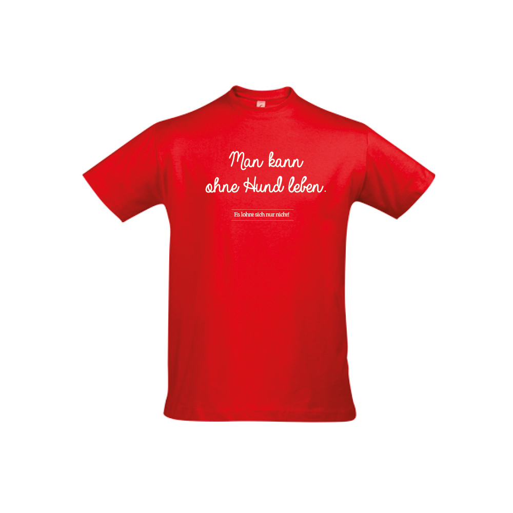 T-Shirt mit dem Motiv „Man kann ohne Hund leben – es lohnt sich nur nicht“ auf der Vorderseite wie abgebildet.