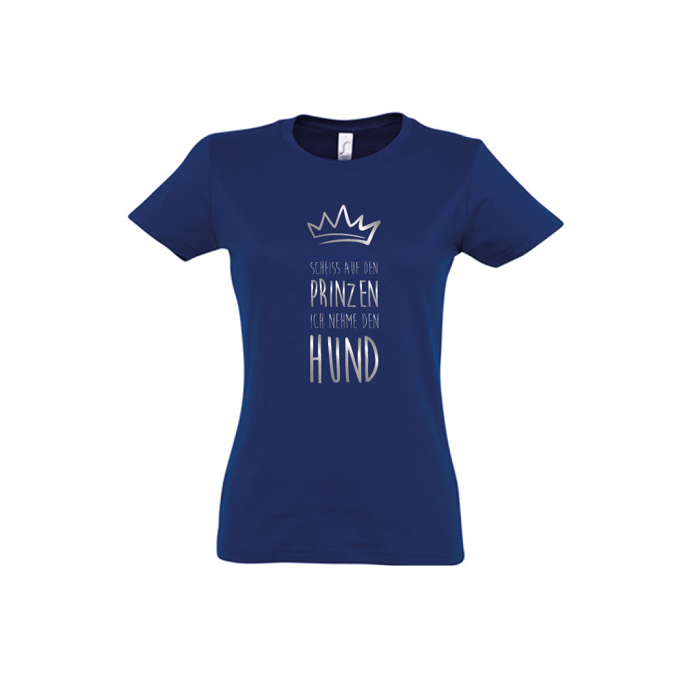 T-Shirt mit dem Motiv „Scheiss auf den Prinzen – ich nehme den Hund“ auf der Vorderseite wie abgebildet.